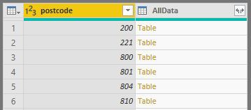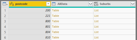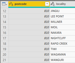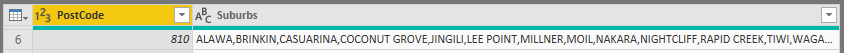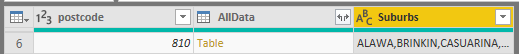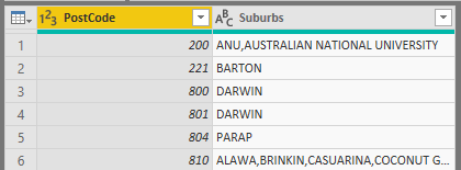 Below I am going to show you how I took the multiple suburb names and put them into a single row, which would then allow me to have a single postal code per row. Which would then allow me to join this to my table using a relationship in my data model.