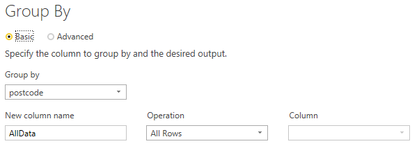 o What I am doing here is to group by the postcode, and then putting the remaining rows effectively into a table by using the “All Rows”