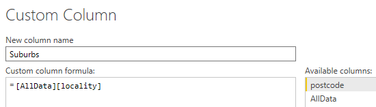 - NOTE: Even though I cannot see the column called [locality] any more in the Available columns, I can still use it in my Custom Column.