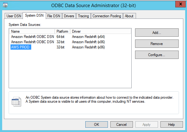 I now completed creating the 32bit ODBC Connection to Redshift, and I could see it in the ODBC Data Source Administrator (32bit)