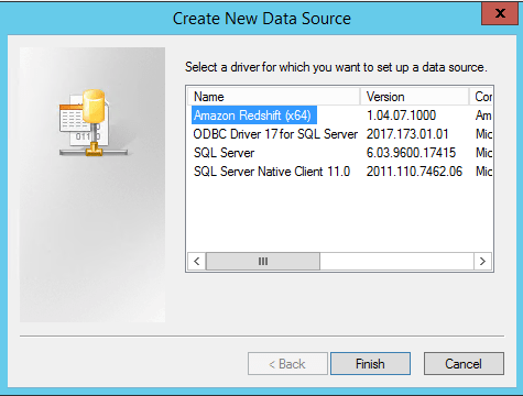 - On the Create New Data Source window I selected Amazon Redshift (x64), then clicked Finish